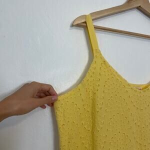 sunny and romantic, this vintage yellow eyelet midi dress is crafted in soft 100% cotton with delicate embroidered eyelet details throughout. the tiered skirt and swingy silhouette bring an effortless, breezy vibe, while the tank straps and v-neckline make it easy to layer or wear on its own. perfect for summer picnics, beach vacations, or everyday wear — just add woven sandals and a straw tote for that timeless cottagecore look. an easy pick for a festival outfit, vacation sundress, or weekend market stroll.