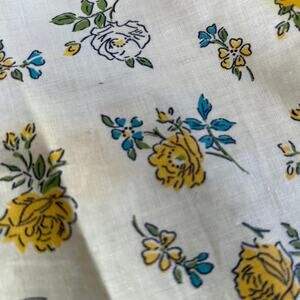 Material: Unknown (cotton or cotton blend main, nylon or organza trim)