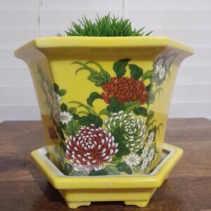 Vintage Yellow Floral Japanese Flower Pot w/Drip Tray 5.5"H
