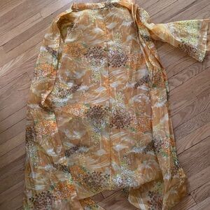 Boho vintage yellow and orange maxi kimono jacket with floral pattern, no tag , I’m 5’6 and it goes all the way to the ground, I usually wear medium, this fits a tad over sized, no closures, perfect for layering