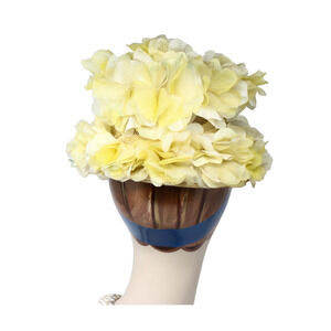 * Material: sheer fabric flowers on a mesh frame, outer edge of brim is finished with yellow velvet