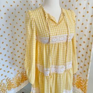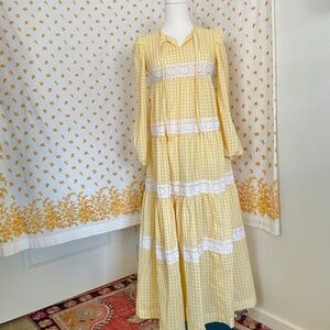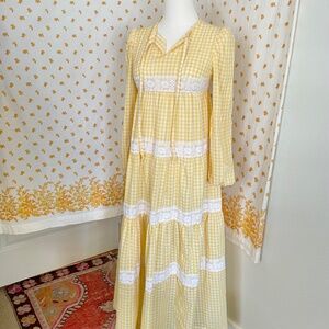 Vintage Yellow Gingham Prairie Maxi Dress Lace Cotton Cottagecore