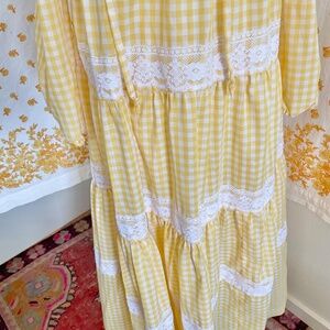 Handmade vintage prairie maxi dress in sunny yellow and white gingham cotton. Features lace trim, puff sleeves, and a zip-up back. Lightweight and unlined — perfect for spring picnics or cottagecore days.