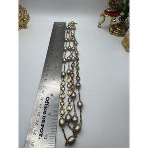 Vintage Yellow Gold Filled Bezel Set Clear Crystals Faux Pearl Necklace Monet