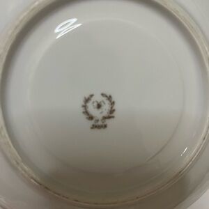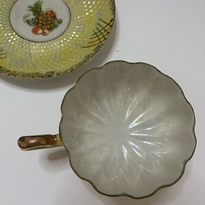 Beautiful vintage ornate bone China fluted tea cup with 3 footed bottom.  Saucer, features fruit, in Center. Cup and saucer are in a pearlescent yellow with gold trim and design. Beautiful to display or treat yourself to a cup of tea. No chips or cracks excellent preowned condition.