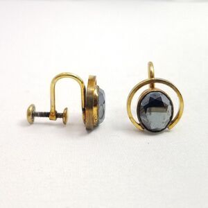Vintage Yellow Gold Filled Oval Dark Gray Rhinestone Clip On Screw Back Earrings