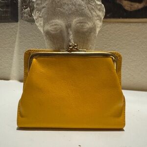 Bright and bold, this vintage yellow leather wallet combines timeless charm with functional design. Featuring a glossy metal clasp closure and elegant gold-tone hardware on the front, it exudes a classic, retro aesthetic. The soft, supple leather boasts a rich texture that highlights its quality and durability. Compact and practical, this wallet is perfect for daily use or as a chic evening accessory. Its vibrant yellow hue adds a cheerful pop of color to any outfit. A must-have for lovers of unique, vintage-style accessories!