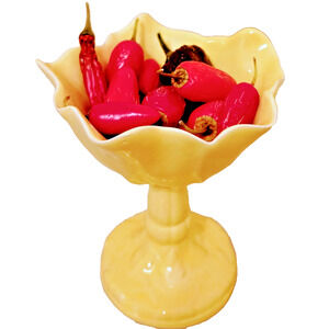 This Vintage Yellow Martan Portugal Pottery Compotes Set of 4 is a charming set of round ceramic dishes made in Portugal in the 1960s. With a glossy yellow finish and printed backstamp, these vintage compote dishes feature a flower theme, perfect for all occasions. The art pottery production style and technique add to their unique appeal, making them a beautiful and functional addition to any home or table setting.