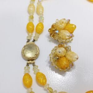 Vintage Yellow Orange Lucite Beaded Necklace & Earrings, AB Crystals, 1960s