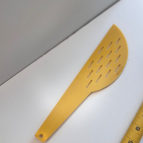 A yellow plastic half-moon shaped kitchen utensil designed for straining pasta. The curved edge features multiple slots for efficient draining, and the long handle allows for easy manipulation.