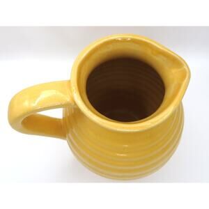 This is a vintage ceramic pitcher with a sunny yellow glaze and ribbed body design. Its versatile size makes it suitable for use as a small pitcher, jug, or vase. The simple farmhouse style adds warmth to any kitchen or dining décor. The base is unmarked.