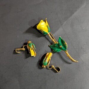 Vintage Yellow Rose Enamel Pin & Clip-On Earrings Set Gold-Toned Floral Jewelry