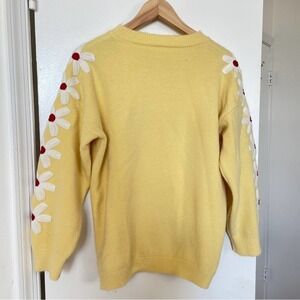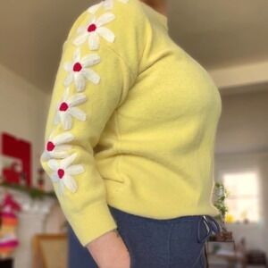 Charming yellow sweater with white floral accents. Red centers add a pop of color. Perfect for a cozy look.