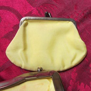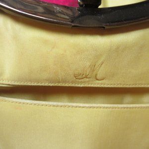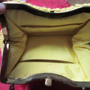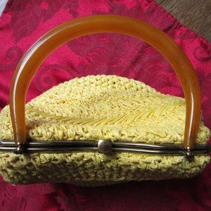 EUC, this stunning straw bag , yellow satin lined with matching yellow satin coin purse by designer MM. The handle is Bakelite and the gold tone hardware is most likely brass as the weight and workmanship are exceptional.