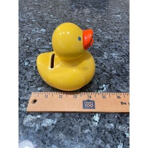Adorable vintage-style ceramic duck bank with a glossy yellow finish, orange beak, and blue eyes. Features a classic rubber duck design with a coin slot on the back. Stands approximately 5 inches tall. Great for nursery decor, bathroom accents, or as a cute collectible. Has minor scuffs as shown, consistent with normal use. No chips or cracks.