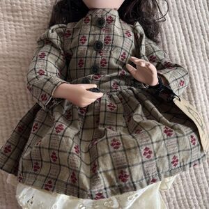 This limited edition collectible doll features green eyes, dark brown curly hair, and comes dressed in a plaid print vintage-style dress with black decorative buttons, eyelet lace slip, cream bloomers, beige socks, and navy blue lace-up shoes