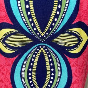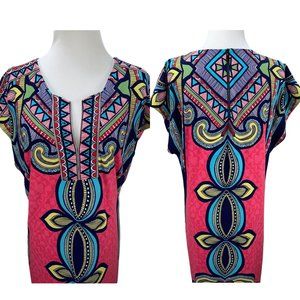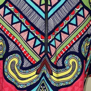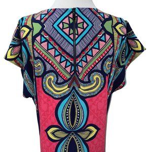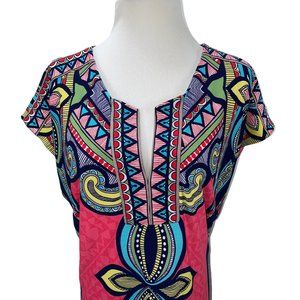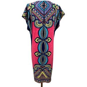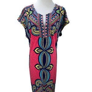 Amazing vintage Laundry by Shelli Segal dress. The quality of construction in this piece is incredible. Relaxed and comfortable shift dress styling. Beautifully colorful pattern accents the neckline and runs down the body. Exposed zipper. Slit neckline. Short sleeves. Lined. At- or below-the-knee on most. Multicolor print with red, pink, blue, white, black +.