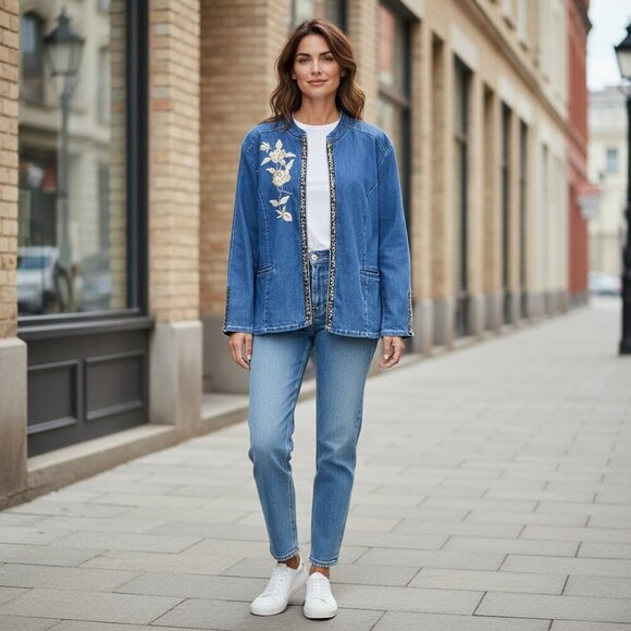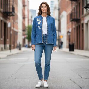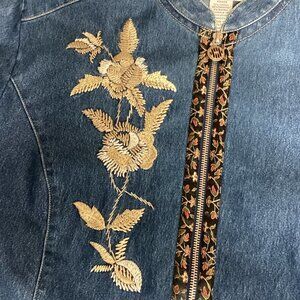 Description: Vintage Yi Lin Oriental Embroidered Flower Embellished Denim Zip Jacket