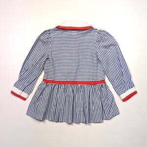 Vintage Youngland stripe drop waist long sleeve dress with a cherry like button area. Size is tagged as 3T, but looks to fit better around 18m.