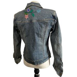 This is a Vintage Yuka Jeans Denim Jacket with Floral Embroidery with Long Sleeves.