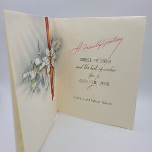 This vintage Christmas card features a picturesque winter scene with a red bow and holly, perfect for sending warm wishes.
