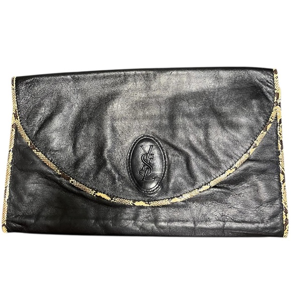 This authentic vintage Yves Saint Laurent fold-over clutch features soft black leather with a stylish snake-print trim along the edges. The front displays the classic oval embossed YSL logo, a hallmark of YSL designs from the 1980s–1990s.