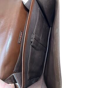 Interior: Lined in leather with two drop in pockets front and back; front pocket has two slip in pockets