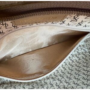 Elegant and timeless, this vintage YSL clutch or pouch features a textured logo jacquard canvas exterior with smooth leather trim and the iconic YSL crest at the front flap.