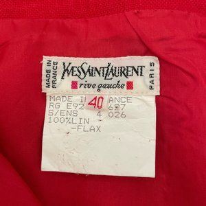 Red linen vtg YSL skirt suit size 40 (US M or 10) made in France is in excellent vintage condition, only flaws are bleached lining in underarm area and a lining repair in the area, no staining visible on linen exterior. All original buttons in excellent condition, linen fabric in excellent condition. Front patch pockets on blazer, slash pockets on skirt. Lovely power suit for your office work wardrobe! Old Money, Elite aesthetic