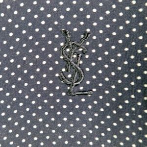 Details: Embroidered YSL logo over left chest. Unlined. Single button neck fastener.