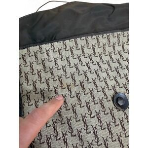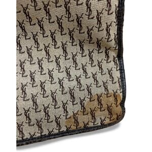 A vintage Yves Saint Laurent pouch portfolio clutch handbag featuring the iconic YSL monogram pattern. This versatile bag offers a secure snap closure and a functional zippered interior compartment, perfect for organizing essentials. Its classic brown canvas construction with leather trim exudes timeless style. Ideal for evening events, travel organization, or as a sophisticated accessory for a day out.