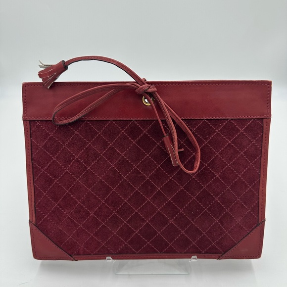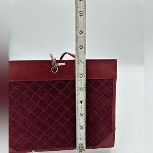 Elevate your style with this chic burgundy suede clutch. Its elegant design and rich color make it a versatile accessory for any occasion.