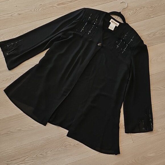 Vintage Yves St. Clair Delicate Black Sheer Cardigan. features vertical beadwork on chest and sleeves. lightweight polyester chiffon, single layer fabric. has one glossy black button for closure. gently flows and flatters the silhouette. side slits. perfect layering piece for the evening or formal wear.