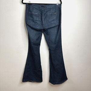 Vintage Z Cavaricci Dark Wash Low Rise Flare Tie Waist Denim Jeans Four Patch Pockets and Distressed hems