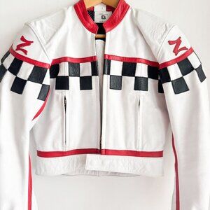 Vintage Z Customs White Leather Geometric Print Cropped Moto Jacket S.