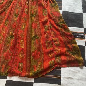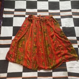 The skirt is in great shape with normal wear, no spots, stains, snags, holes or fade. Colors are bright reds, orange, golds and greens. Size Medium but can fit up to a XL so please check photos and measurements carefully for best description and let me know if you have any questions. Has adjustable waist with tie.