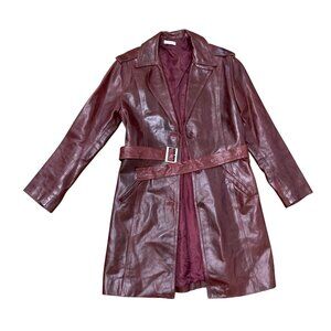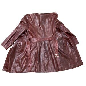 This Italian-made coat showcases a rich burgundy leather, ideal for adding sophistication to your wardrobe. The belted waist enhances the fit, offering a sleek silhouette and a timeless appeal.