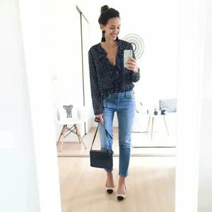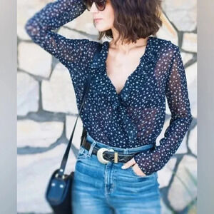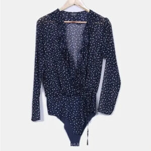 In excellent condition Zara navy blue bodysuit with white stars. Sheer long sleeves and ruffles around neck. Poly/Elastic blend. Size small