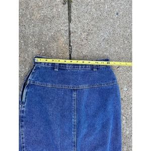 The skirt is long and comes in a size 3, making it perfect for casual occasions. The denim fabric is giving it a classic and retro look. It also features a designer logo accent, pockets, and is made in the USA. This skirt is a timeless piece that will elevate any wardrobe.