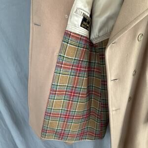 Elegant midcentury Zero King overcoat in a classic camel tone. Made from 100% pure virgin wool, this coat features a removable plush collar that appears to be genuine mouton (sheepskin). The collar is satin-lined on the inside, and the coat is finished with a luxurious full lining that includes a tartan wool facing. A beautifully tailored, timeless piece of craftsmanship.