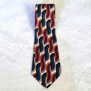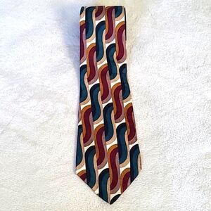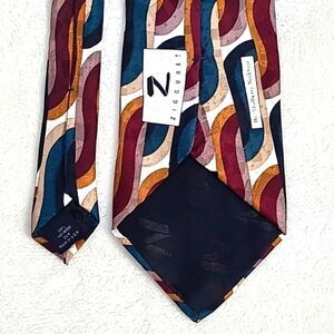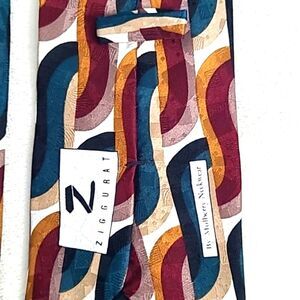 Vintage Ziggurat By Mulberry Neckwear, 100% Silk Men's Necktie in Green, Burgundy, Cream , White and Black Geometric Pattern. Classic Length and Width. Tipping in Black Fabric with Z Design. Keeper Loop Intact, Bar Tack Intact. The Seam is Lifting in Some Areas Throughout the Necktie, But Seam is Still Fully Intact and Functional. (See last 2 Pics). Measurements Shown are Approximate. Made in USA.