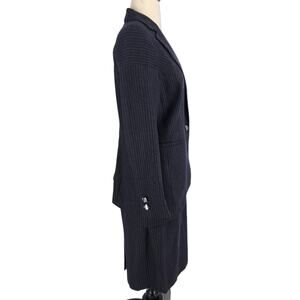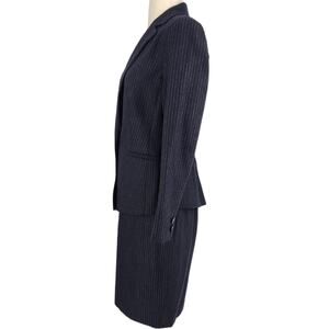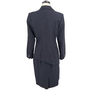 Stunning quality on this fine and fleece wool suit with an asymmetrical jacket hem and unique darts throughout! Matching pinstripe skirt and mirrored metal square buttons round out the eye catching details. Fabric from Italy and Made in the USA. A rare vintage item in perfect wearable condition!
