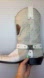 Step out in standout Western style with these rare Vintage Zodiac Angels Cowboy Boots. Crafted from genuine leather in a striking white finish, these boots feature an exotic-textured vamp, decorative harness straps with metal hardware, and the signature Zodiac Angels emblem on the shaft. Perfect for collectors, Western wear enthusiasts, or anyone looking to add bold vintage flair to their outfit.