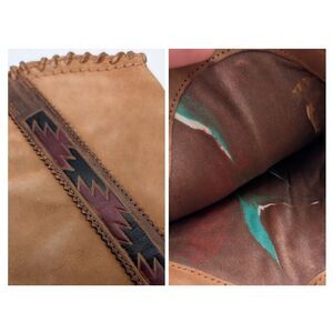 Super fun vintage Zodiac Southwestern cowboy boots made in the USA with genuine brown suede leather. They are perfectly distressed and broken in. The boots feature a Navajo-inspired leather inlay design along the shaft, whipstitch trim at the top and a printed fabric lining. Pointed toe, stacked leather heel and genuine leather sole. Classic mid-calf height and timeless Western style.