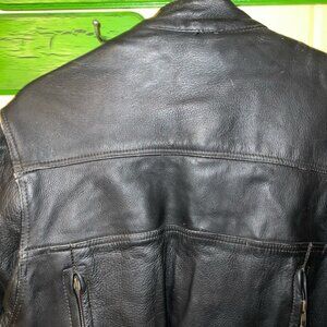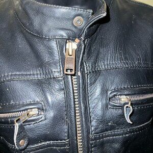 Zony Inc heavy duty black genuine leather jacket with front and back pockets- one of the zippers for the back pocket is stuck but i’m sure it could be fixed! Also pocket inside.