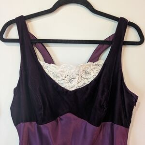 flashback in time with this vintage zumzum eggplant purple velvet and satin dress from 90's/00's. has pearl lace detail. junior size size 13/14. please see measurements before purchasing. in good pre-loved condition shows minor wear from age but no holes or stains. see all photos as they represent the listing. perfect for prom or dance!!