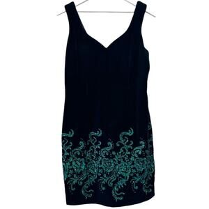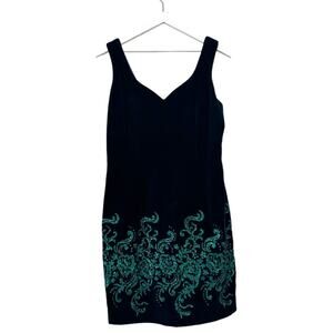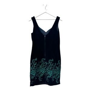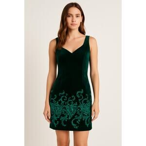 Vintage Zum Zum sleeveless velvet party dress in size 9. This elegant emerald mini dress features striking emerald green glitter baroque-style detailing along the hem, adding a unique vintage touch. Designed with a flattering V-neckline, structured fit, and soft velvet fabric – perfect for cocktail parties, holiday events, or retro-inspired looks.