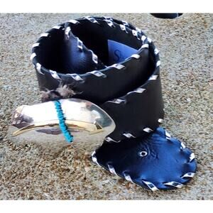 Discover a truly unique piece of Southwestern artistry with this Vintage Zuni Bear Leather Belt. This rare and beautiful belt features a sacred guardian bear, representing healing, strength, and protection.