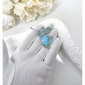 Stunning Native American trumpeting angel pin made from shimmery blue fire opal and sterling silver. A multitude of cut stones have been set to show off this large design which makes a great angelic guardian. Perfect pin for the Christmas holiday or anytime you need some angelic presence.