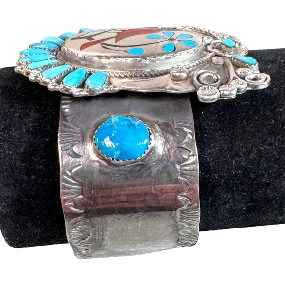 Vintage Zuni Sterling Silver Turquoise Coral Cuff Bracelet Red Cardinal Inlay De